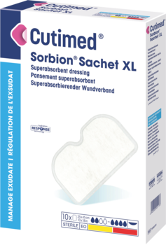 Indicaties: Cutimed Sorbion Sachet XL is bedoeld voor de behandeling van exsuderende wonden met matig tot zeer veel exsudaat, zoals decubitus, ulcus cruris, diabetische voetulcera en andere wonden die secundair genezen, lekkende laparotomie wonden, fistels op de huid, oncologische ulcera, postoperatieve wonddehiscentie en vergelijkbare exsuderende wonden.